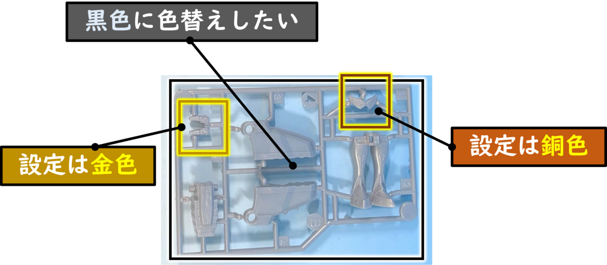 さて、前回のブログでもご紹介しましたが今回のブラックオニタイジンを再現するにあたって、”通常版では再現不可能な配色がある”とご紹介しました。(以下、おさらいの図)
