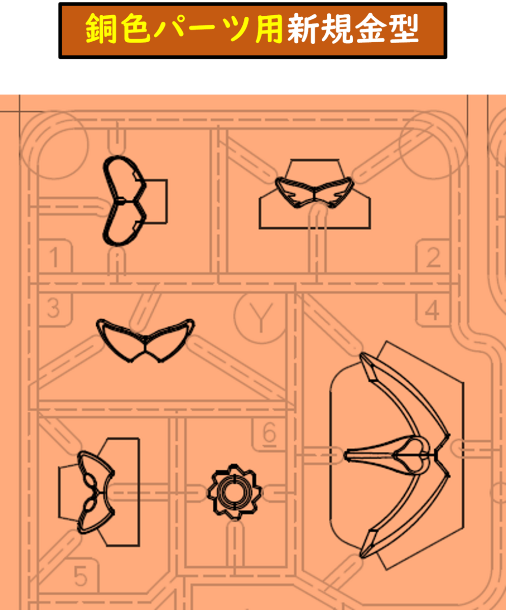 これは予想できませんでしたが無事、ミニプラで再現可能!幸い、胸部と頭部のシール変更と、金型配置に余裕があった新規金色パーツのレイアウトを変更するだけですみました!