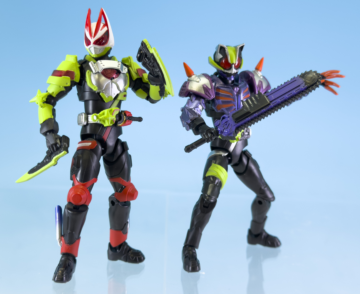 別売りの「掌動EXceed 仮面ライダー1 仮面ライダーギーツ マグナムブーストフォーム」(別売り)を持っている方は、今回の仮面ライダータイクーンのセット内容に仮面ライダーギーツにセットできる頭部パーツを付属しておりまして、「仮面ライダーギーツ ニンジャブーストフォーム」の姿にフォームチェンジできます。同じように「仮面ライダーバッファ ゾンビフォーム」を持っている方は上半身パーツに、仮面ライダータイクーンに付属している「仮面ライダータイクーン ゾンビフォーム」用のマスクパーツを取り付けることで、「仮面ライダータイクーン ゾンビフォーム」にフォームチェンジできます。